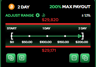 Breakout则跟Stay in完全相反,订单成交后你的初始价值将从本金价值的200%开始递减,一直到BTC价格上涨或者下跌超出了价格区间。如果价格没有超出区间,价值将持续递减 24小时后递减到100%的本金价值,2天到期后归零。同样例子,买入了100 USD的Breakout并成交后,价格越早突破订单的价格区间利润则越多,如果超过24小时后价格还没有突破价格区间,将面临亏损。