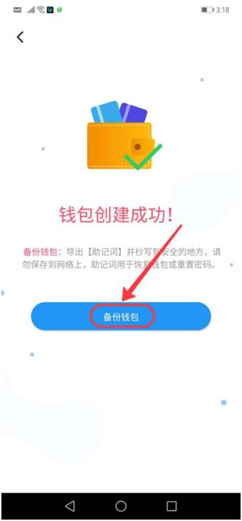 第五步:钱包创建成功后需备份钱包,点击“备份钱包”, 如下图: