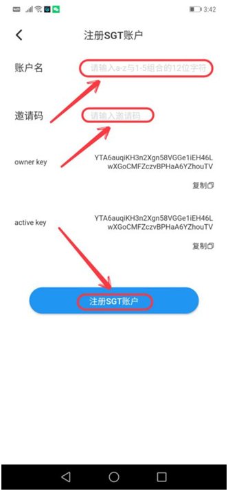 第十一步、填入“账户名”(注:请输入a –z与1-5组合的12位字节)如:abcd12345123;再输入推荐人的邀请码,点击“注册SGT账户”,如下图: