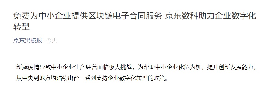 IT之家了解到,京东数科智臻链近期推出专门针对中小企业的“普惠云签”扶持计划,面向所有完成实名认证的企业用户,在2020年12月31日之前为其提供免费的区块链电子合同云签约服务。该计划不设门槛,不设上限,旨在扶持中小企业实现疫情期间的合同云端签署,推动企业数字化转型,减少社会人员流动风险和时间成本。