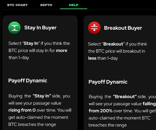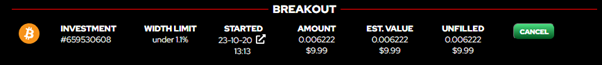 Breakout则跟Stay in完全相反,订单成交后你的初始价值将从本金价值的200%开始递减,一直到BTC价格上涨或者下跌超出了价格区间。如果价格没有超出区间,价值将持续递减 24小时后递减到100%的本金价值,2天到期后归零。同样例子,买入了100 USD的Breakout并成交后,价格越早突破订单的价格区间利润则越多,如果超过24小时后价格还没有突破价格区间,将面临亏损。